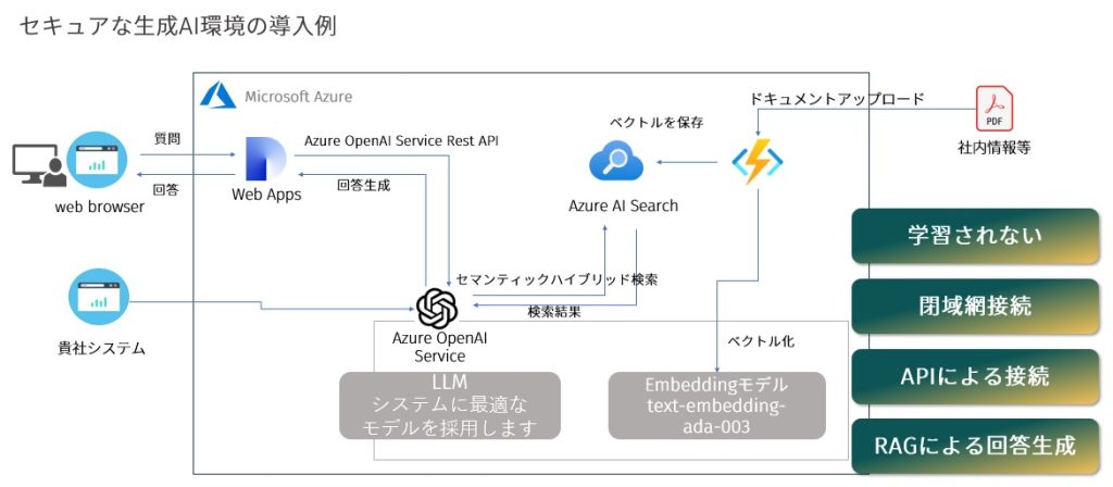 社外には学習されず、自社内でのナレッジ共有を可能とする生成AI環境を構築します。
